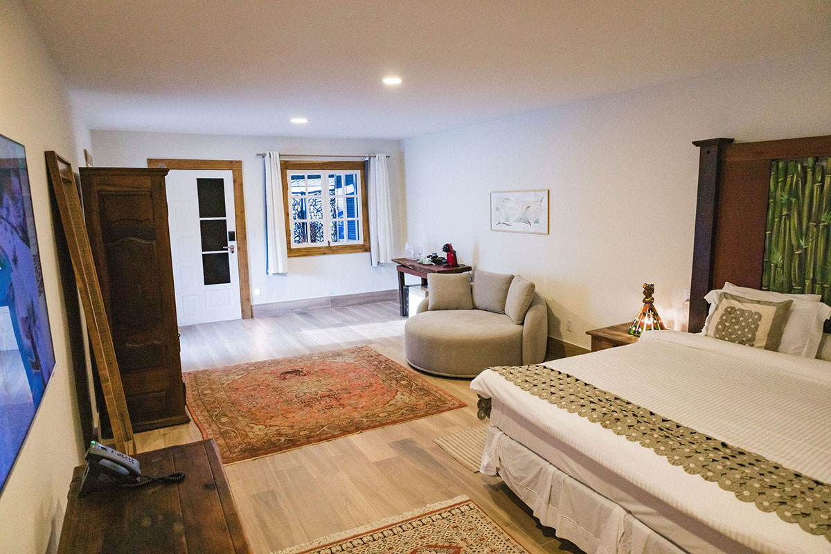 Apartamento pet friendly. Apartamentos especiais com lareira e varanda. Cama king size, sendo possível adicionar uma cama extra de solteiro (ou berço).
